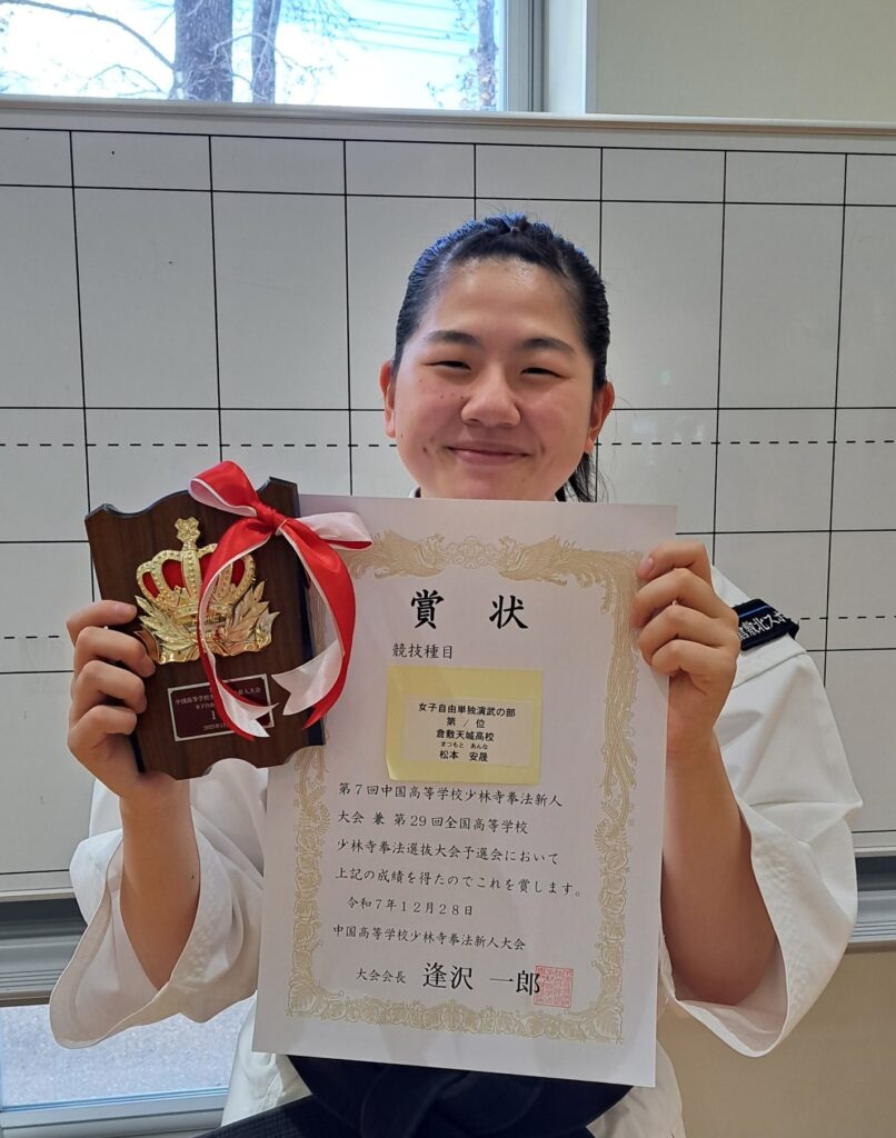 12月28日に岡山武道館で行われた第7回中国高等学校少林寺拳法新人大会の女子自由単独演武の部において、1年生の松本安晟さんが優勝しました。